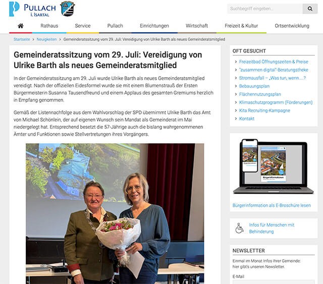 In der Gemeinderatssitzung am 29. Juli wurde Ulrike Barth als neues Gemeinderatsmitglied vereidigt. Nach der offiziellen Eidesformel wurde sie mit einem Blumenstrauß…