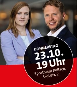 Die SPD Pullach & SPD Schäftlarn laden ein zur Veranstaltung „AfD-Verbot – ja oder nein?“. Es diskutieren Carmen Wegge (MdB) und Johannes Reichart (BR) um 19 Uhr im Sportheim Pullach.